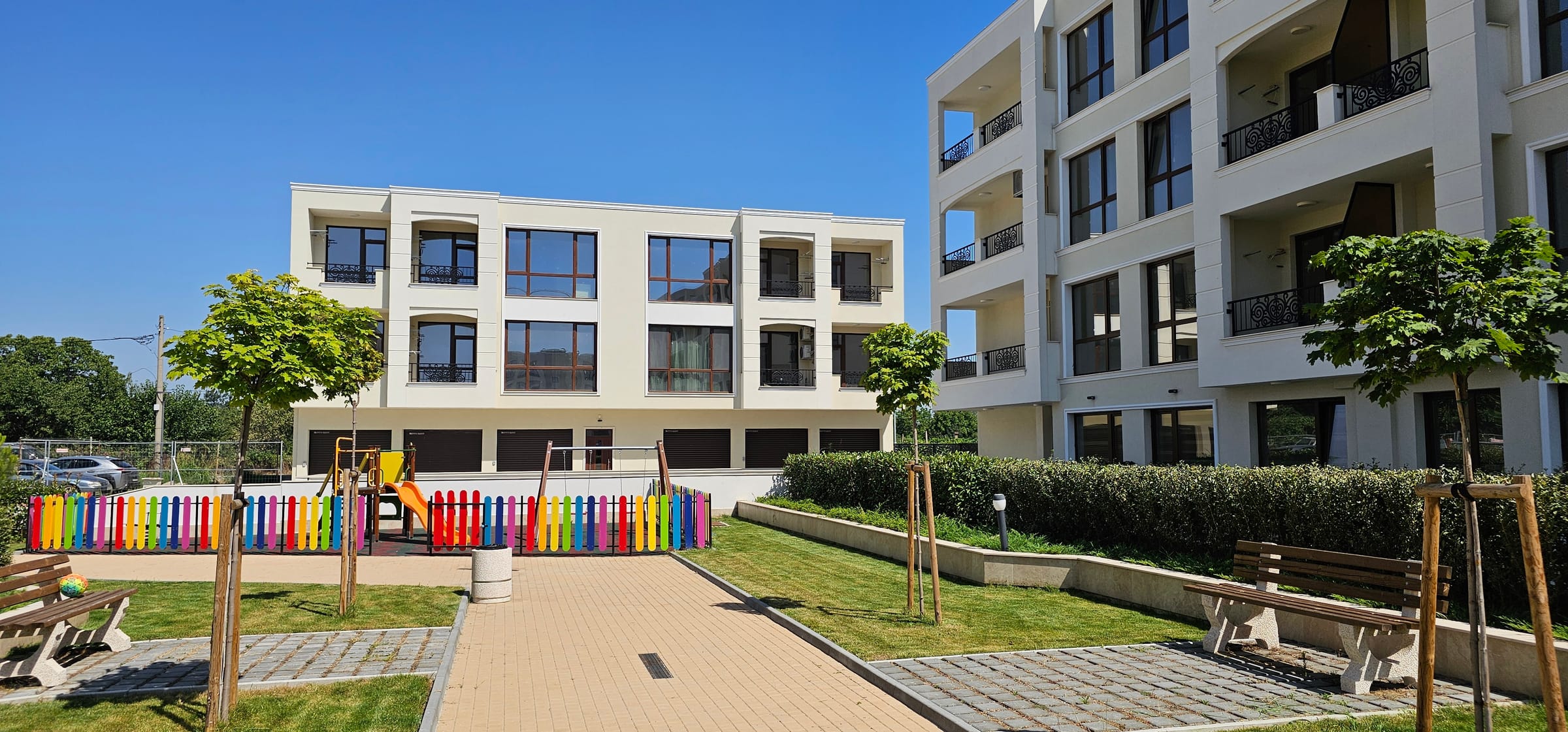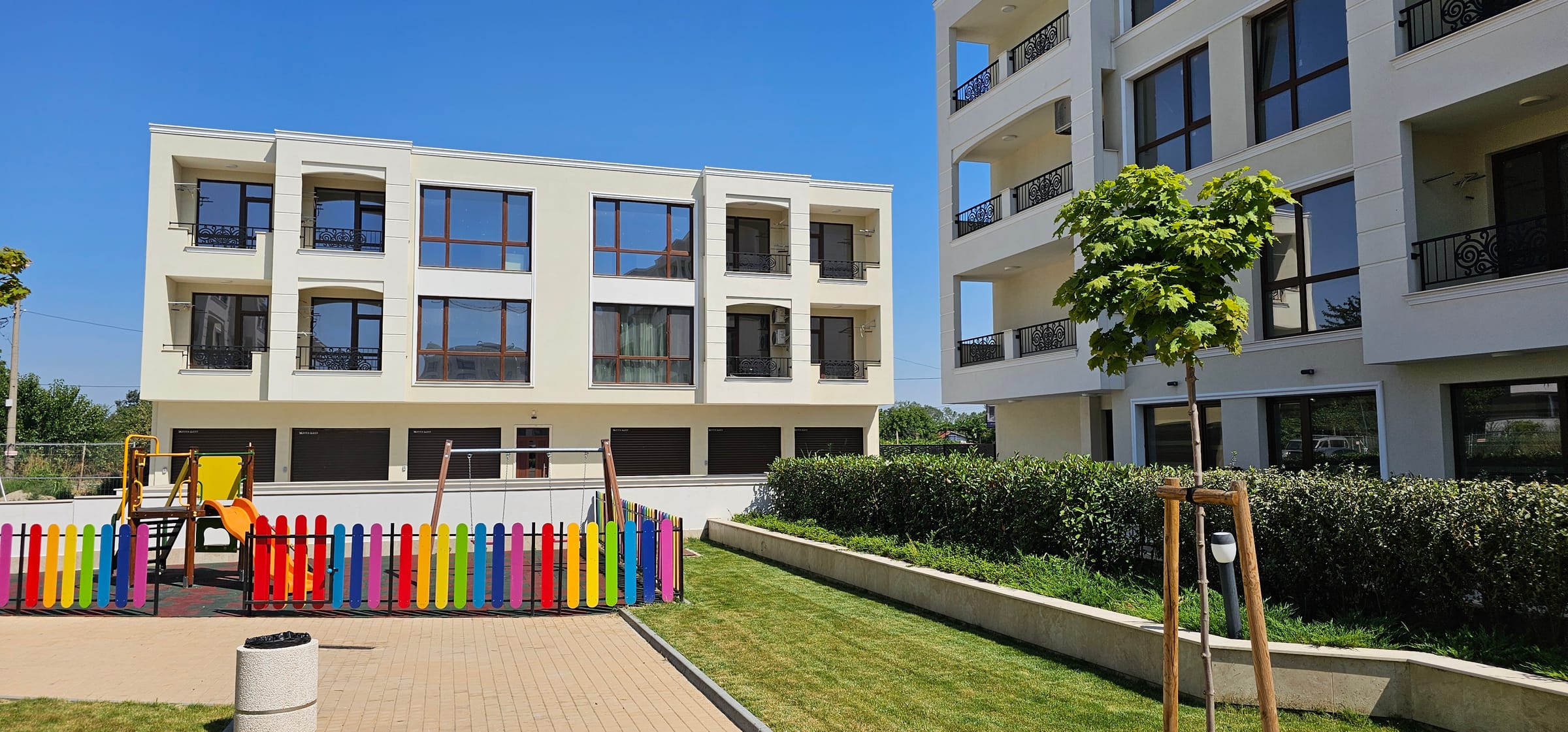 Детска площадка и озеленяване с различни видове растителност за ексклузивно ползване