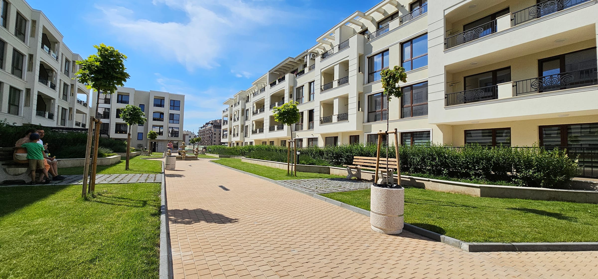 Внимателно проектирани общи части с асансьор, озеленяване и детска площадка за комфорт на цялото семейство.